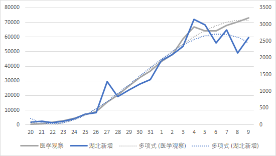 经下图可知,从20日到5日湖北新增病例与医学观察的三次多项式拟合曲线几乎一致,可认为新增病例与医学观察人数线性相关,为正比关系