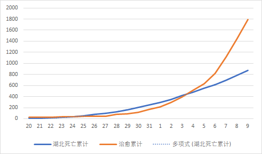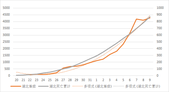 经下图可知,湖北死亡人数与重症人数多项式拟合曲线几乎一致,可认为重症病人的死亡率现阶段维持在一个比较稳定的数值
