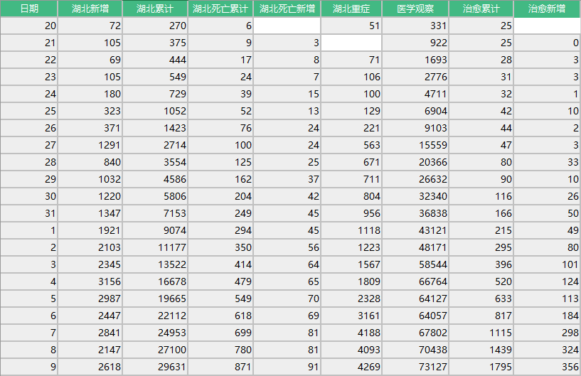 下表为20日到9日的疫情数据(数据均来自湖北省卫生健康委员会)