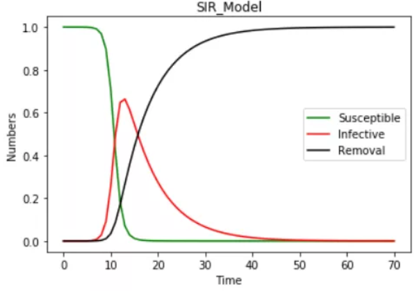 下图表示了随着时间t的变化S、I、R人数的一个变化趋势。