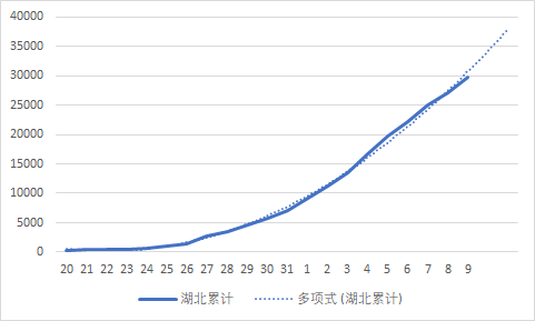 由下图知,近期湖北患者在以双曲线形式缓慢增长